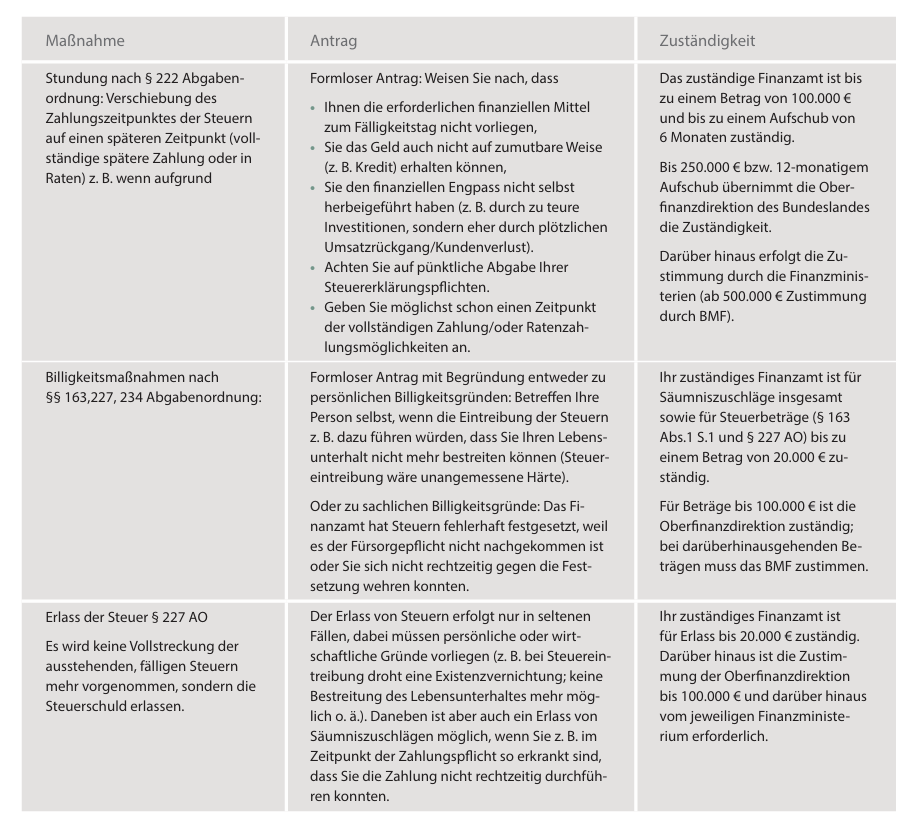 Eine Billigkeitsmaßnahme im Steuerrecht bedeutet, dass Ihre Steuerzahlungen durch das Finanzamt gemindert oder erlassen werden, weil die Steuererhebung im entsprechenden Einzelfall unbillig wäre. Ein Erlass der obersten Länder vom 7.8.2025 (Az. S 0336) regelt – mit Bezug auf das BMF-Schreiben vom 5.07.2023 (Az. IV D 1-S 0336/20/10004:003) – welche Behörde je nach Betrag und Art der Stundungs- oder Billigkeitsmaßnahme zuständig ist. Aus der Tabelle können Sie entnehmen, welche Optionen es gibt, wie Anträge zu stellen sind und wer zuständig ist. Übrigens: Gewährt ein Finanzamt Ihnen eine Billigkeitsmaßnahme, obwohl diese laut Erlass nicht zuständig war? Keine Sorge: Die gewährte Billigkeitsmaßnahme bleibt dann trotzdem gültig. Es ist jedoch für Sie gut zu wissen, welche Behörden generell zuständig sind. Denn in einem solchen Fall nehmen die Sachbearbeiter oftmals auch Kontakt nach entsprechender Antragstellung mit Ihnen auf, um Rückfragen zu klären.