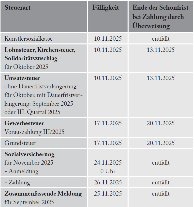 Die Übersicht über die Steuertermine hilft Ihnen, rechtzeitig für die notwendigen finanziellen Mittel zu sorgen, damit Sie Ihre steuerlichen Verpflichtungen termingerecht erfüllen können. So vermeiden Sie Verspätungs- und Säumniszuschläge und gelten beim Finanzamt als zuverlässiger Steuerzahler – das bringt Ihnen den Vorteil, dass Sie eher einen Zahlungsaufschub genehmigt bekommen, sollte es dann doch einmal eng werden. Falls Sie Ihre Steuern per Scheck bezahlen, achten Sie bitte darauf, dass Ihre Zahlung dann erst 3 Tage nach Eingang des Schecks beim Finanzamt als geleistet gilt (§ 224 Abs. 2 Nr. 1 AO). Erteilen Sie dem Finanzamt ein SEPA-Lastschriftmandat, gilt die Zahlung als bei Fälligkeit geleistet, wenn die Bank die Lastschrift einlöst.