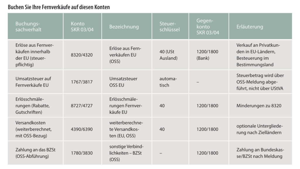 Mit der Wahl der richtigen Buchungskonten behalten Sie nicht nur den Überblick über Ihre EU-weiten Fernverkäufe, sondern schaffen auch die Grundlage für eine korrekte Umsatzsteuerdeklaration. Eine saubere Trennung der Umsätze nach Bestimmungsländern erleichtert zudem die Erstellung der OSS-Meldungen erheblich, denn so können Sie die entsprechenden Umsätze später ohne großen Aufwand den jeweiligen EU-Staaten zuordnen. Je nach eingesetztem Buchhaltungsprogramm oder Kontenrahmen (SKR 03 bzw. SKR 04) empfiehlt es sich, eigene Erlöskonten für Fernverkäufe in die einzelnen EU-Länder anzulegen.